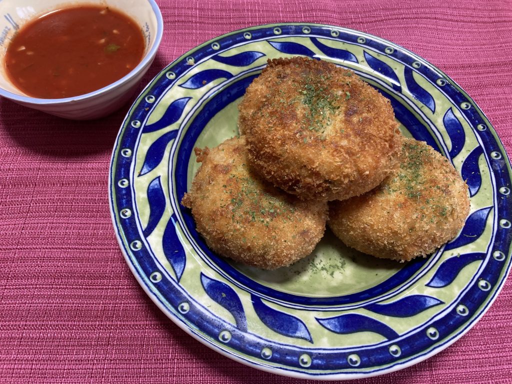 • Roll each rice ball in flour, making sure it is evenly coated. Then, dip it into the beaten eggs, followed by a coating of breadcrumbs. Ensure each ball is fully covered.